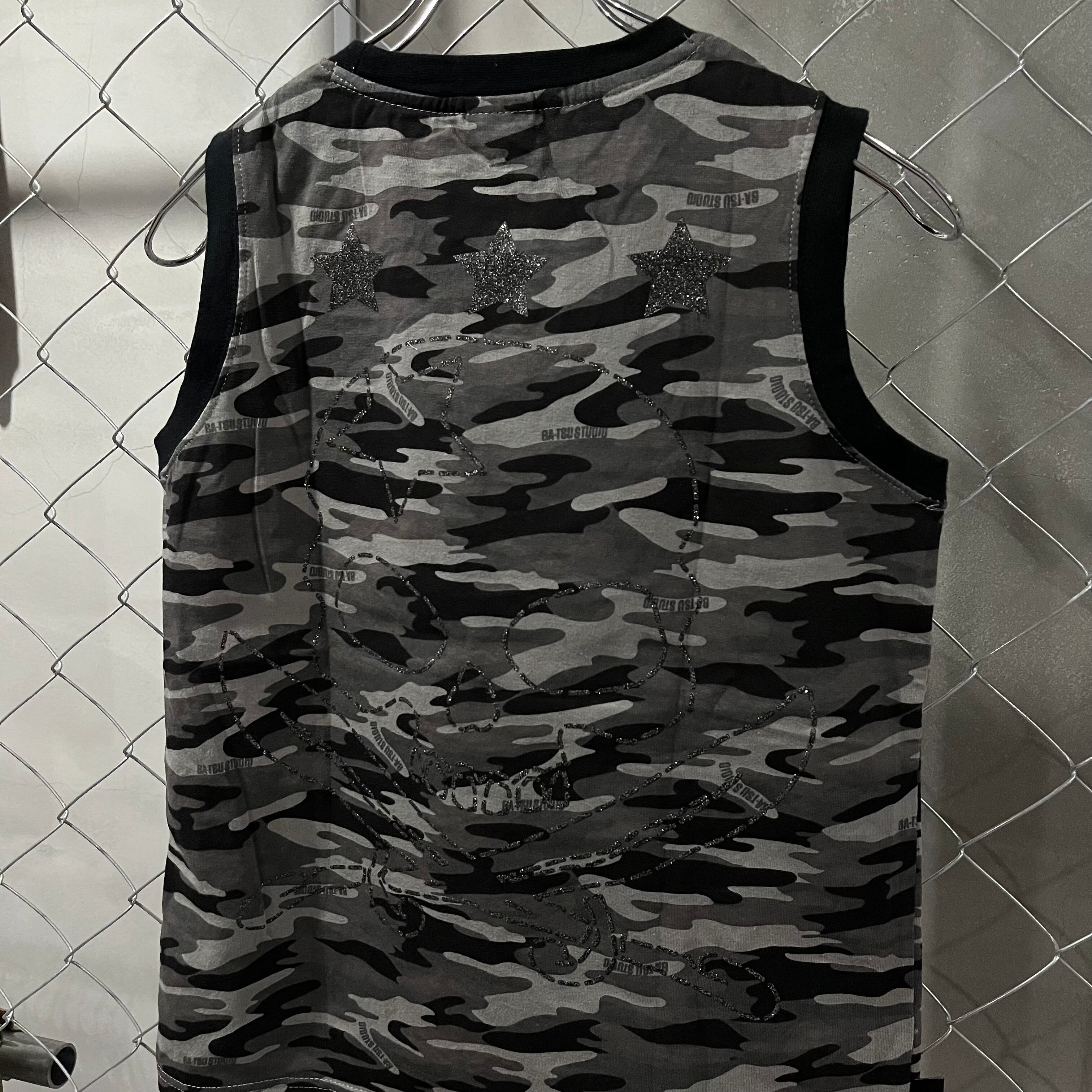 ドクロ迷彩タンクトップ グレー ラメプリント