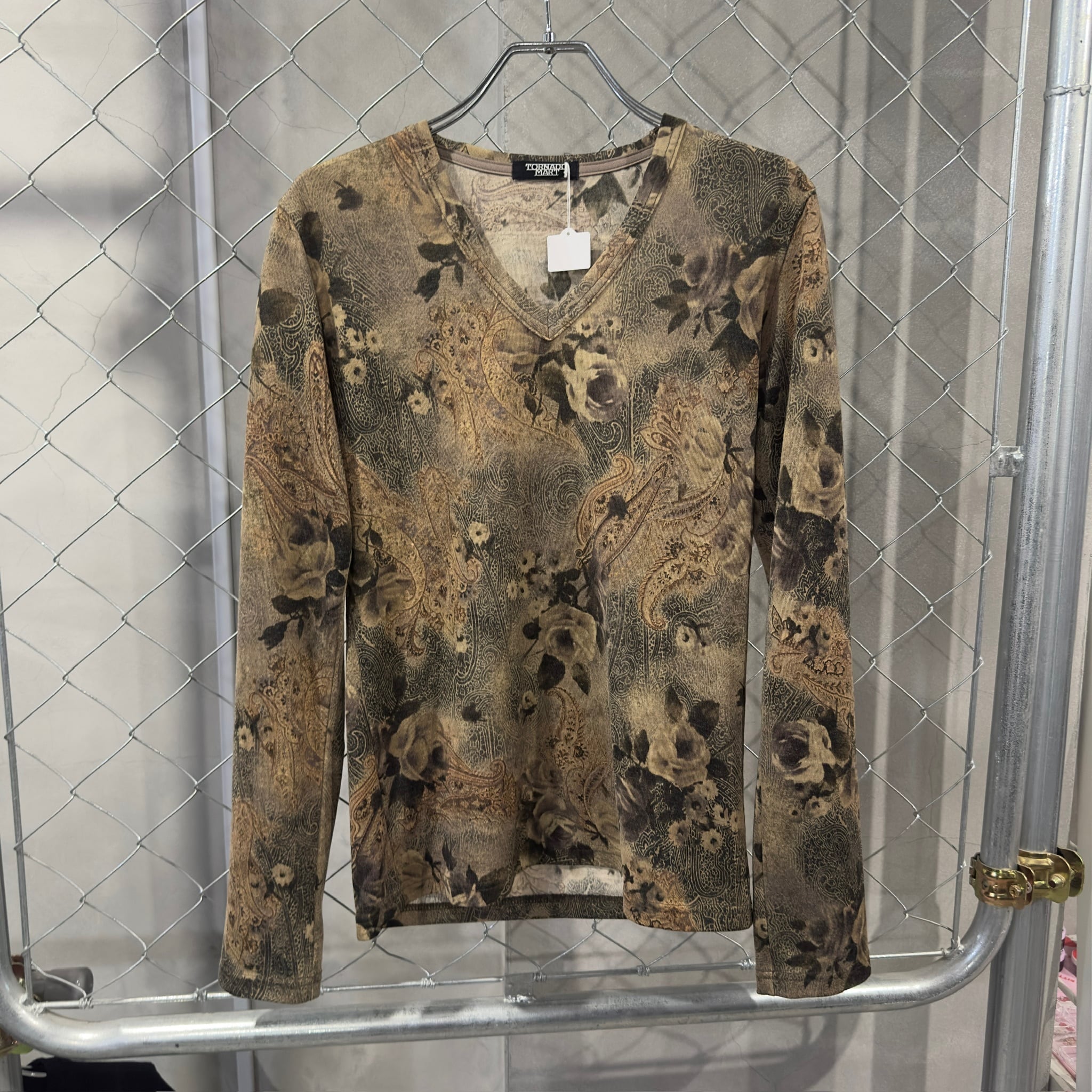 トルネードマート ブラウンパッチワーク Vネックトップス